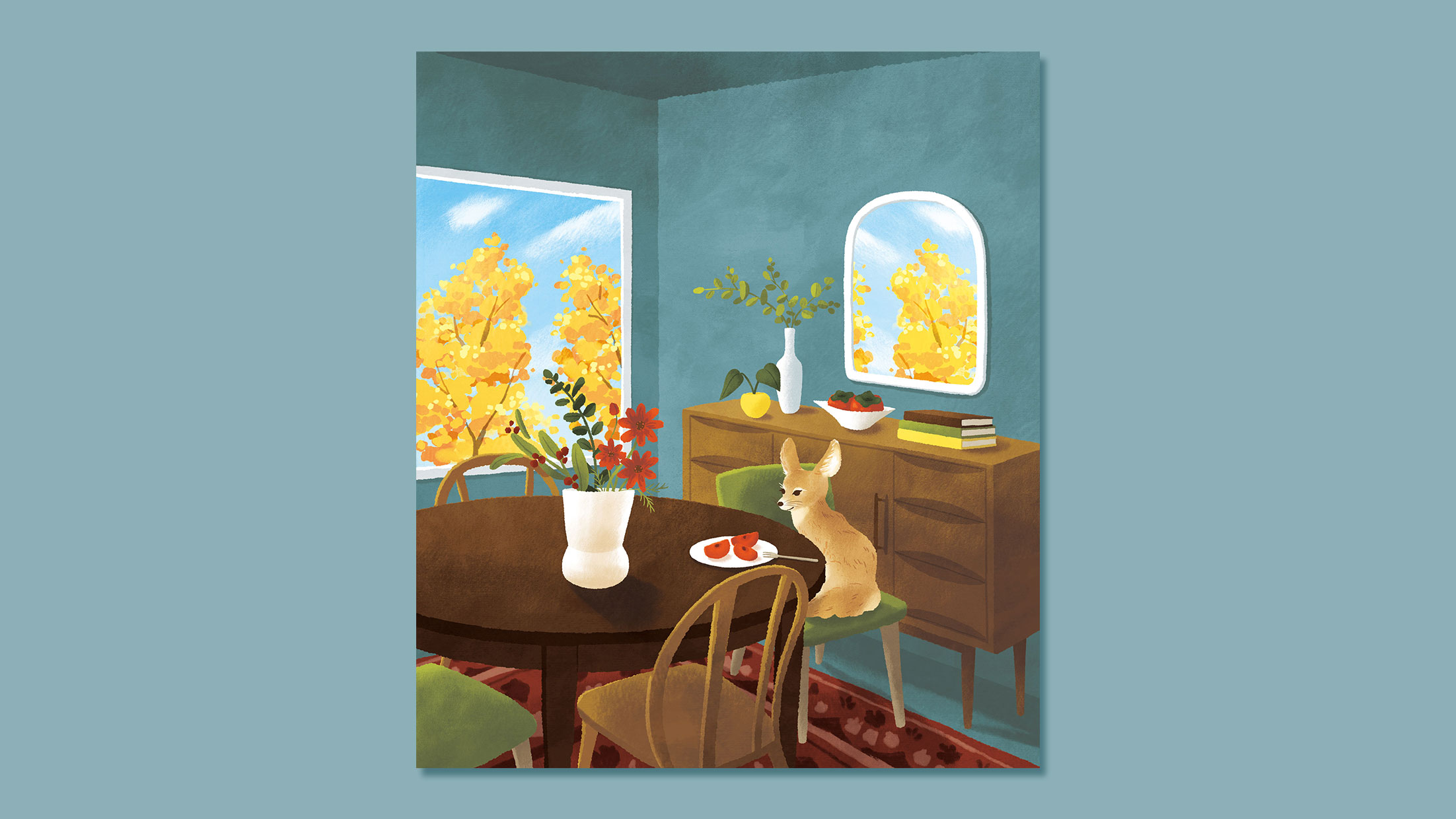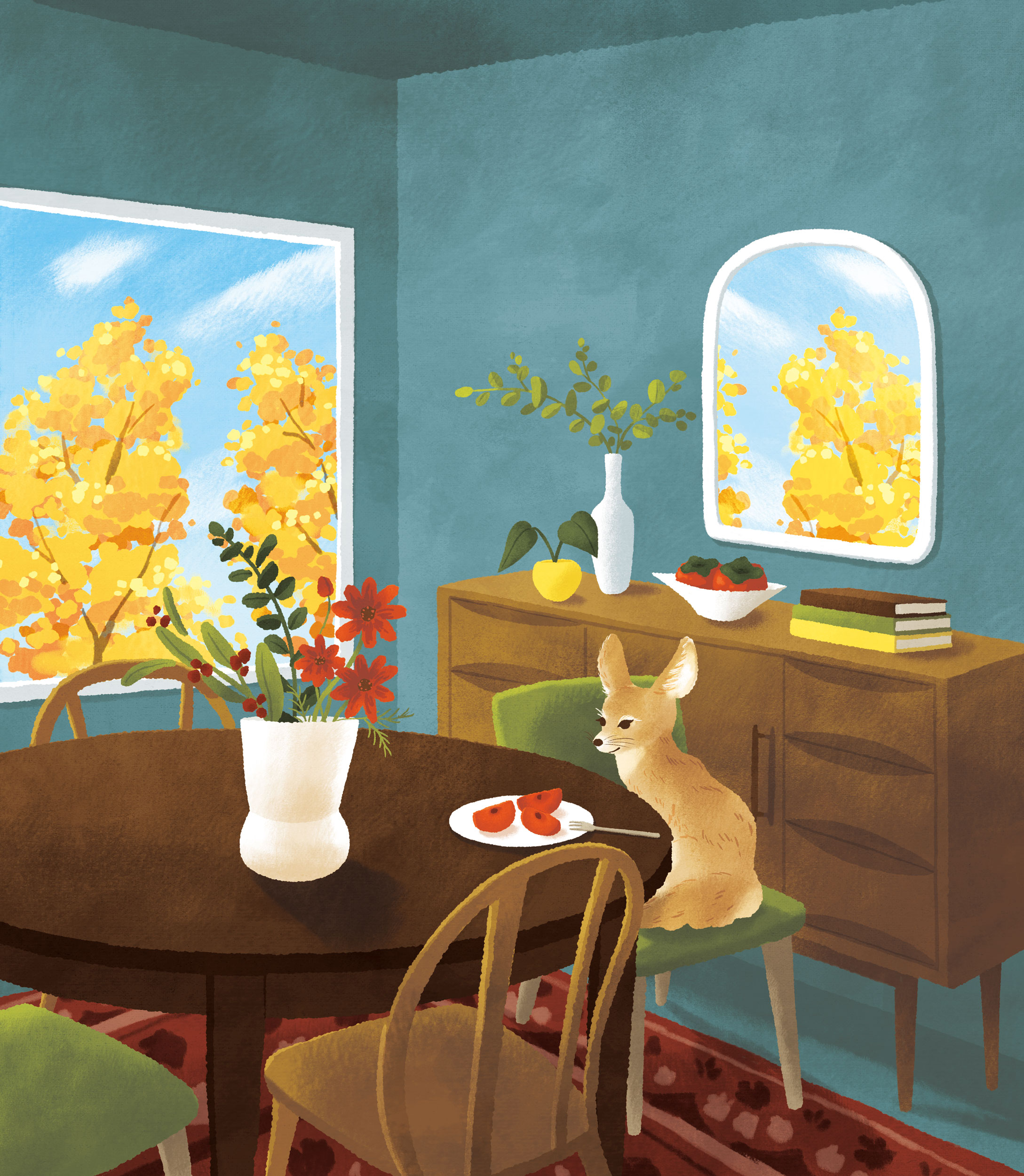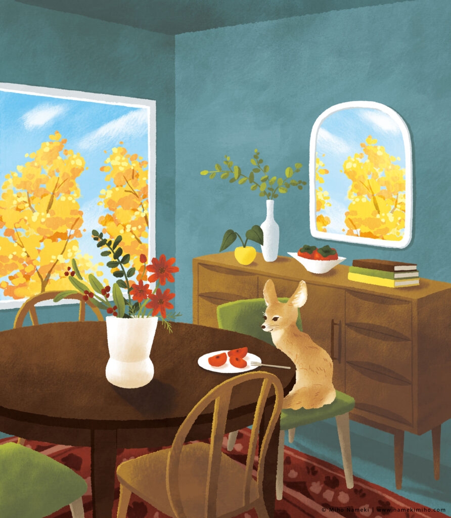 2025年秋号は、窓から紅葉が見える、シックで落ち着いた色合いのリビング。フェネックが美味しそうな柿を見つめています。